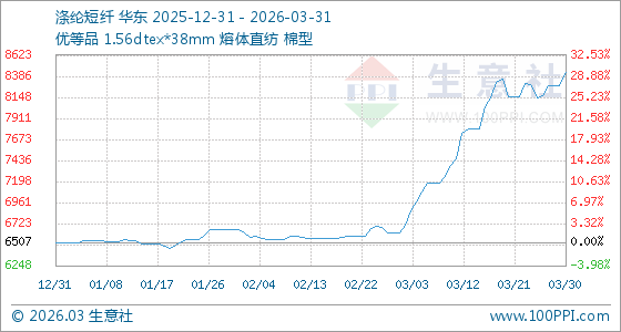 3月31日,生意社涤纶短纤基准价为8426.02元/吨,与本月初(6611.53元/吨)相比,上涨了27.44%。