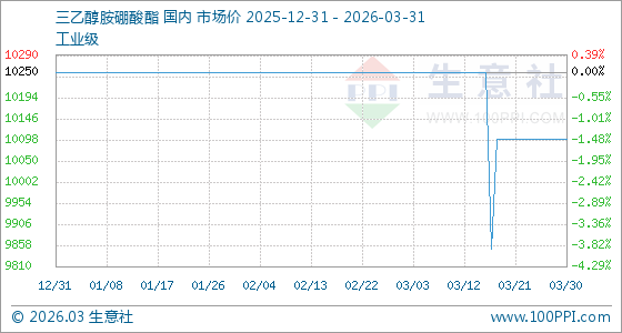 3月31日,生意社三乙醇胺硼酸酯基准价为10100.00元/吨,与本月初(10250.00元/吨)相比,下降了1.46%。