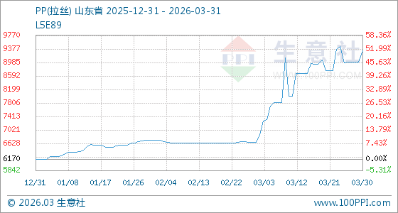 3月31日,生意社PP(拉丝)基准价为9316.67元/吨,与本月初(6663.33元/吨)相比,上涨了39.82%。