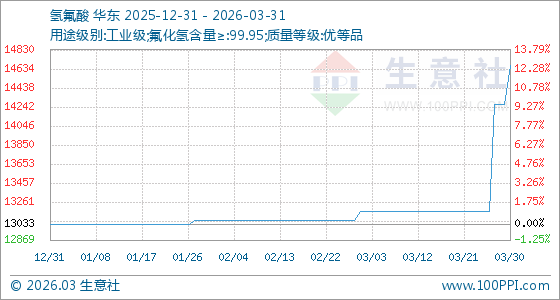 3月31日生意社氢氟酸基准价为14666.67元/吨