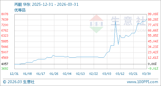 3月31日,生意社丙酮基准价为7712.50元/吨,与本月初(4600.00元/吨)相比,上涨了67.66%。