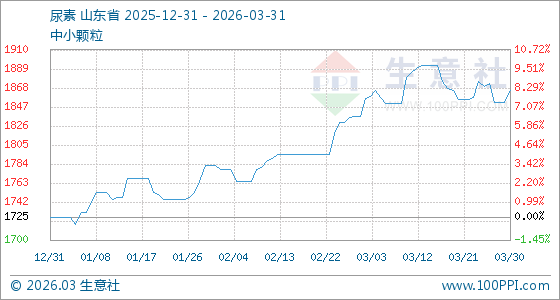 3月31日,生意社尿素基准价为1865.00元/吨,与本月初(1836.25元/吨)相比,上涨了1.57%。
