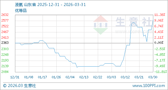 3月31日,生意社液氨基准价为2586.67元/吨,与本月初(2166.67元/吨)相比,上涨了19.38%。