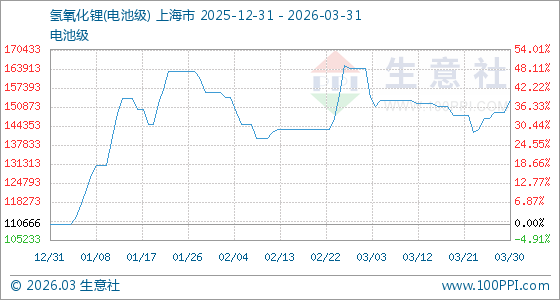 3月31日生意社氢氧化锂(电池级)基准价为153000.00元/吨