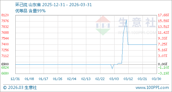 3月31日,生意社环己烷基准价为7400.00元/吨,与本月初(6900.00元/吨)相比,上涨了7.25%。