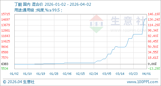 4月2日,生意社丁酮基准价为14866.67元/吨,与本月初持平。