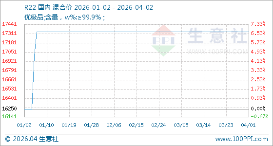 4月2日,生意社R22基准价为17333.33元/吨,与本月初持平。