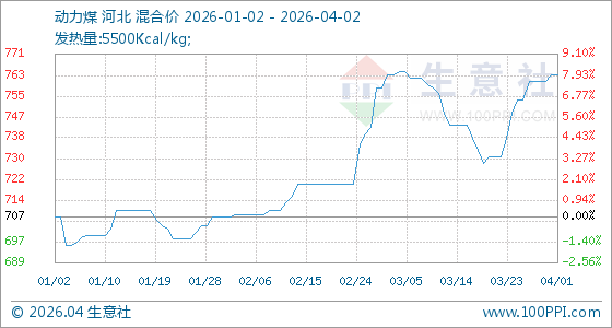4月2日,生意社动力煤基准价为763.75元/吨,与本月初持平。