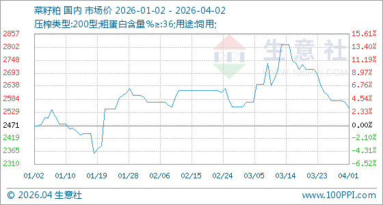 4月2日,生意社菜籽粕基准价为2546.00元/吨,与本月初(2570.00元/吨)相比,下降了0.93%。