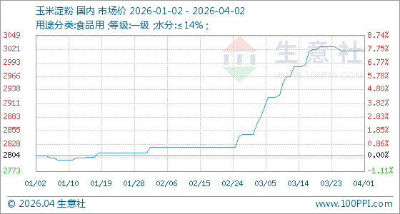 4月2日,生意社玉米淀粉基准价为3018.00元/吨,与本月初持平。