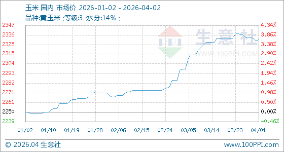 4月2日,生意社玉米基准价为2331.43元/吨,与本月初(2330.00元/吨)相比,上涨了0.06%。