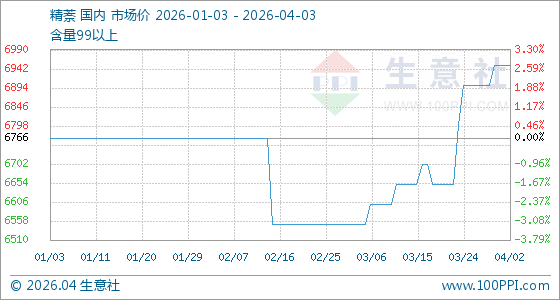 4月3日,生意社精萘基准价为6950.00元/吨,与本月初持平。