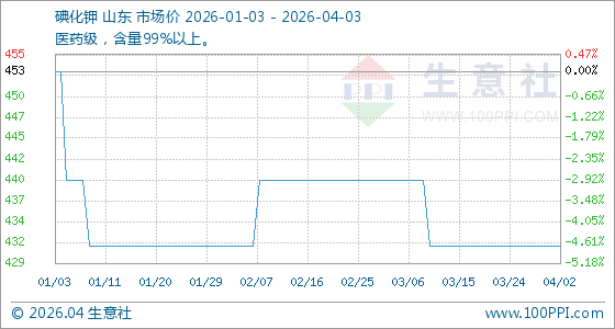 4月3日,生意社碘化钾基准价为432.00元/公斤,与本月初持平。