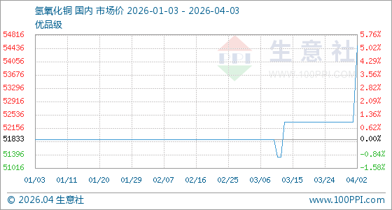 4月3日,生意社氢氧化铜基准价为54500.00元/吨,与本月初(52333.33元/吨)相比,上涨了4.14%。
