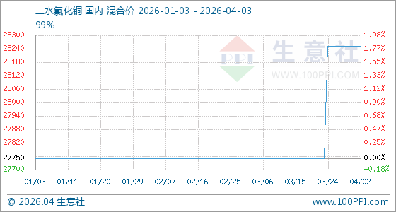4月3日,生意社二水氯化铜基准价为28250.00元/吨,与本月初持平。