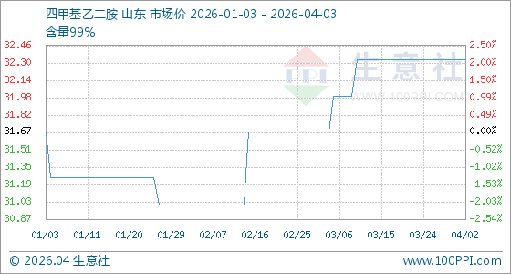4月3日,生意社四甲基乙二胺基准价为32.33元/千克,与本月初持平。