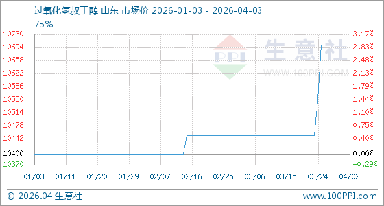 4月3日,生意社过氧化氢叔丁醇基准价为10700.00元/吨,与本月初持平。