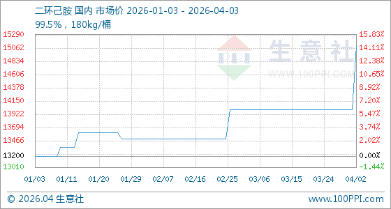 4月3日,生意社二环己胺基准价为15100.00元/吨,与本月初(14000.00元/吨)相比,上涨了7.86%。