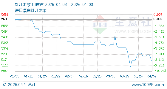 4月3日,生意社针叶木浆基准价为5150.00元/吨,与本月初(5233.33元/吨)相比,下降了1.59%。