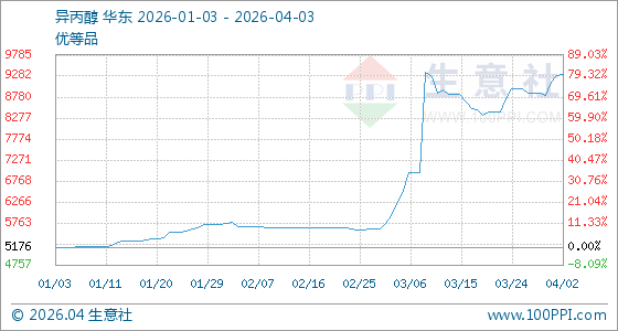 4月3日,生意社异丙醇基准价为9333.33元/吨,与本月初(9150.00元/吨)相比,上涨了2.00%。