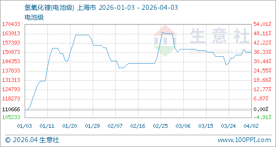 4月3日,生意社氢氧化锂(电池级)基准价为151000.00元/吨,与本月初持平。