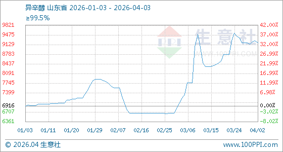 4月3日,生意社异辛醇基准价为9200.00元/吨,与本月初(9233.33元/吨)相比,下降了0.36%。