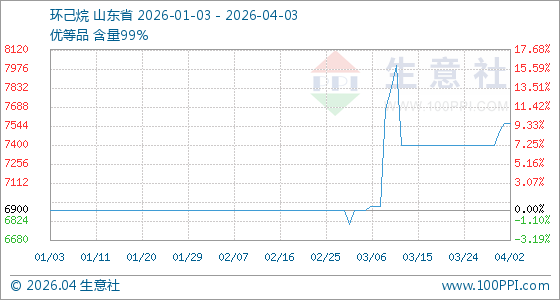 4月3日,生意社环己烷基准价为7566.67元/吨,与本月初(7500.00元/吨)相比,上涨了0.89%。