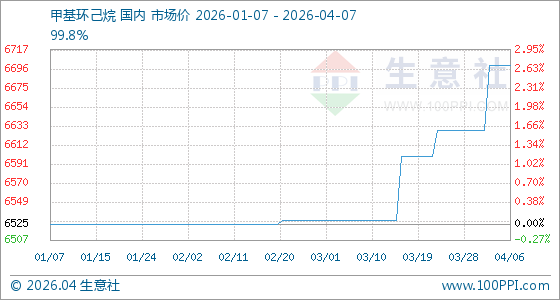 4月7日,生意社甲基环己烷基准价为6700.00元/吨,与本月初(6628.57元/吨)相比,上涨了1.08%。