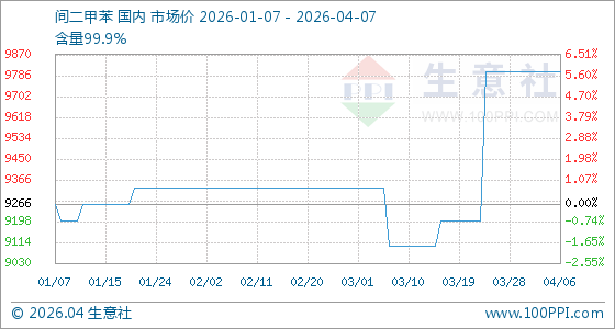 4月7日,生意社间二甲苯基准价为9800.00元/吨,与本月初持平。
