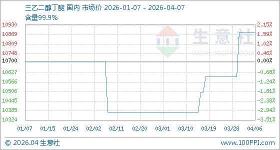 4月7日,生意社三乙二醇丁醚基准价为10880.00元/吨,与本月初持平。