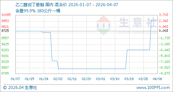 4月7日,生意社乙二醇叔丁基醚基准价为9975.00元/吨,与本月初(9300.00元/吨)相比,上涨了7.26%。