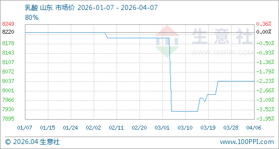 4月7日,生意社乳酸基准价为8037.50元/吨,与本月初持平。