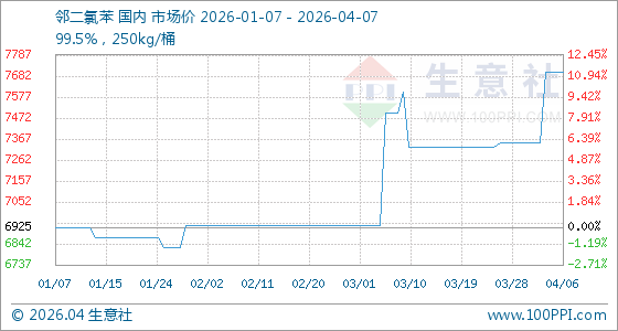 4月7日,生意社邻二氯苯基准价为7700.00元/吨,与本月初(7350.00元/吨)相比,上涨了4.76%。