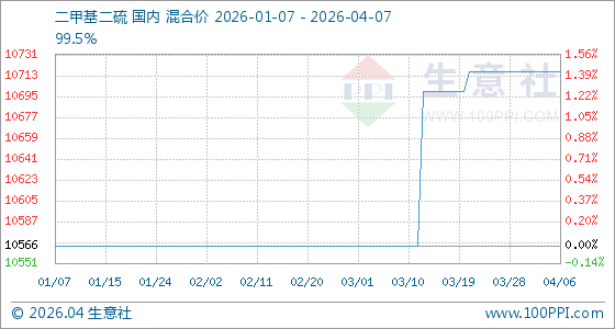 4月7日,生意社二甲基二硫基准价为10716.67元/吨,与本月初持平。