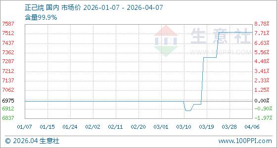 4月7日,生意社正己烷基准价为7525.00元/吨,与本月初持平。
