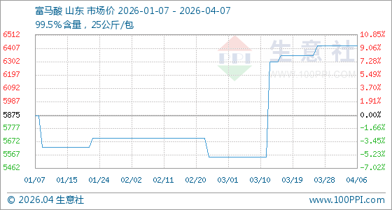 4月7日,生意社富马酸基准价为6425.00元/吨,与本月初持平。
