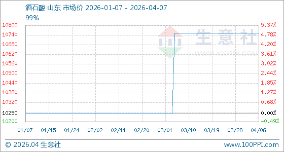 4月7日,生意社酒石酸基准价为10750.00元/吨,与本月初持平。