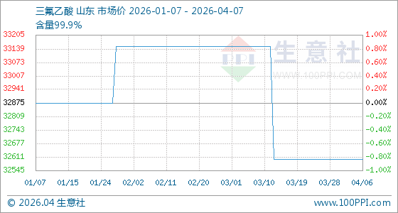 4月7日,生意社三氟乙酸基准价为32600.00元/吨,与本月初持平。
