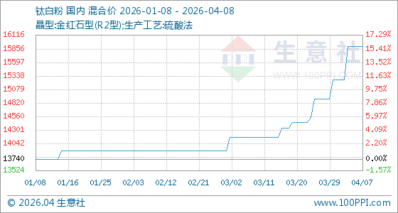 4月8日,生意社钛白粉基准价为15900.00元/吨,与本月初(15260.00元/吨)相比,上涨了4.19%。