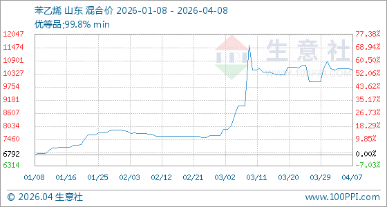4月8日,生意社苯乙烯基准价为10500.00元/吨,与本月初(10890.00元/吨)相比,下降了3.58%。