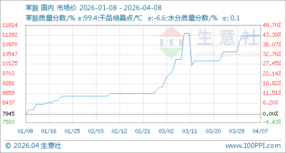 4月8日,生意社苯胺基准价为11362.50元/吨,与本月初持平。