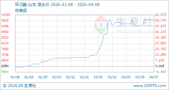 4月8日,生意社环己酮基准价为9900.00元/吨,与本月初(9500.00元/吨)相比,上涨了4.21%。