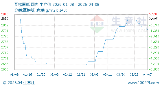 4月8日,生意社瓦楞原纸基准价为2794.00元/吨,与本月初(2822.00元/吨)相比,下降了0.99%。