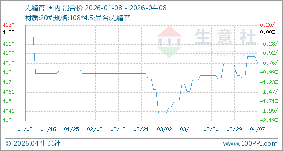 4月8日,生意社无缝管基准价为4090.00元/吨,与本月初(4078.00元/吨)相比,上涨了0.29%。