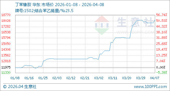 4月8日,生意社丁苯橡胶基准价为18150.00元/吨,与本月初(17850.00元/吨)相比,上涨了1.68%。