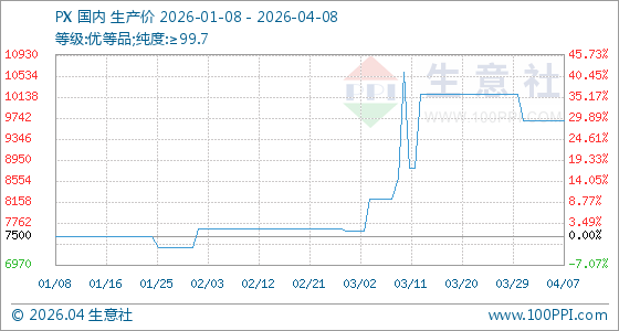 4月8日,生意社PX基准价为9700.00元/吨,与本月初持平。