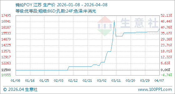 4月8日,生意社锦纶POY基准价为16050.00元/吨,与本月初(15725.00元/吨)相比,上涨了2.07%。