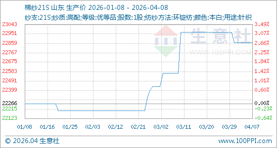 4月8日,生意社棉纱21S基准价为22866.67元/吨,与本月初持平。