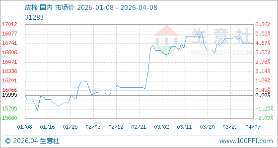 4月8日,生意社皮棉基准价为16731.33元/吨,与本月初(16847.00元/吨)相比,下降了0.69%。