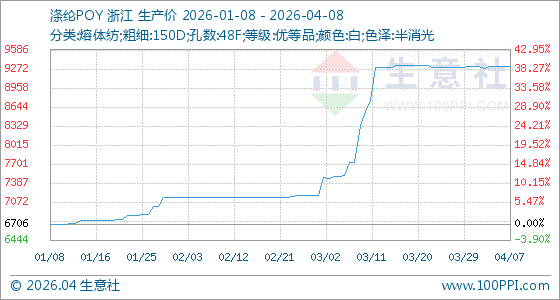 4月8日,生意社涤纶POY基准价为9312.50元/吨,与本月初持平。